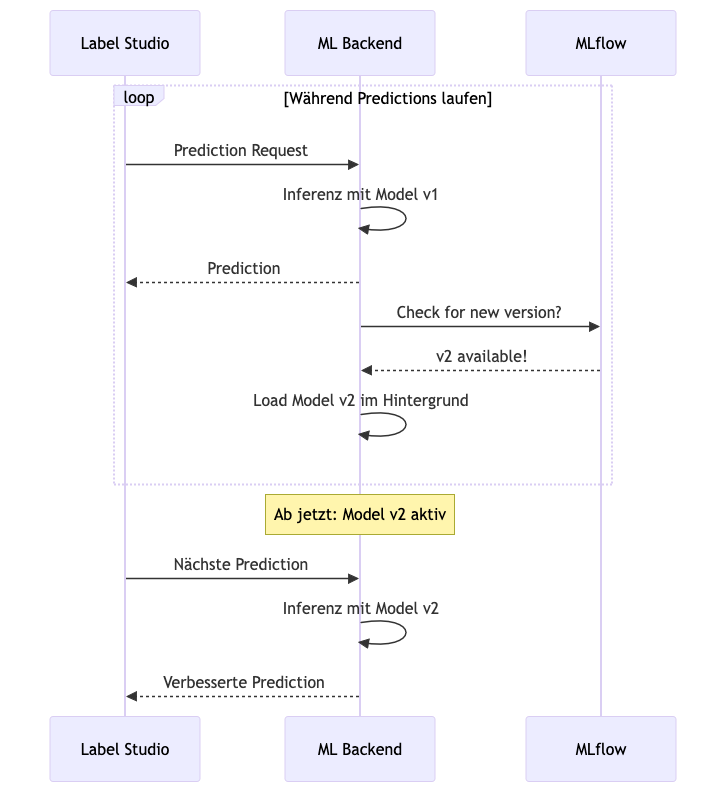 python scripts/create_new_model.py \ --model cat_and_dog_classifier \ --problem-type classification \ --classes "Cat,Dog" \ --architecture pretrainedmodels/cats_and_dogs_classifier/ ├── model.py # Modell-Architektur (z.B. MobileNetV2) ├── backend.py # ML Backend Implementation ├── config.yaml # Konfiguration (Single Source of Truth) └── docker-compose.yaml # Deployment Configconfig.yaml ist dabei das Herzstück: Sie definiert nicht nur Hyperparameter, sondern auch die Label Studio Integration, S3-Pfade, Modell-Architektur und sogar die Labeling-Templates. Alles an einem Ort und versioniert in Git.