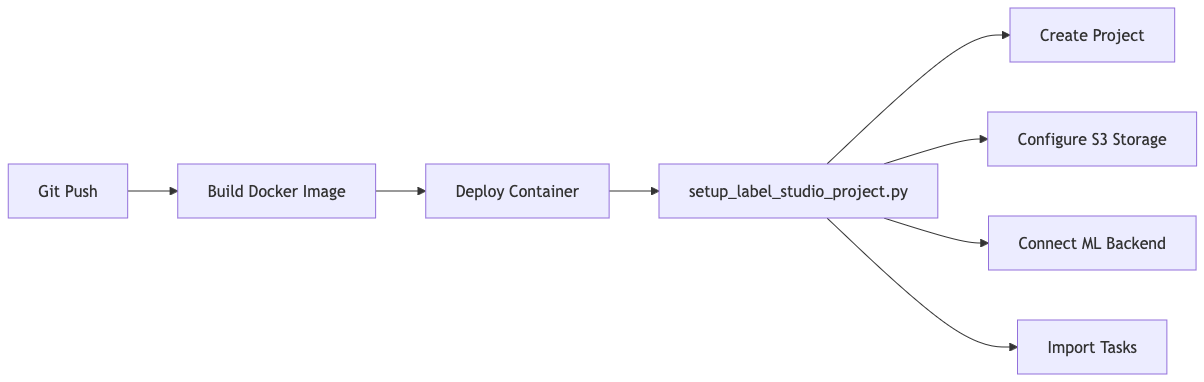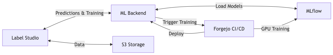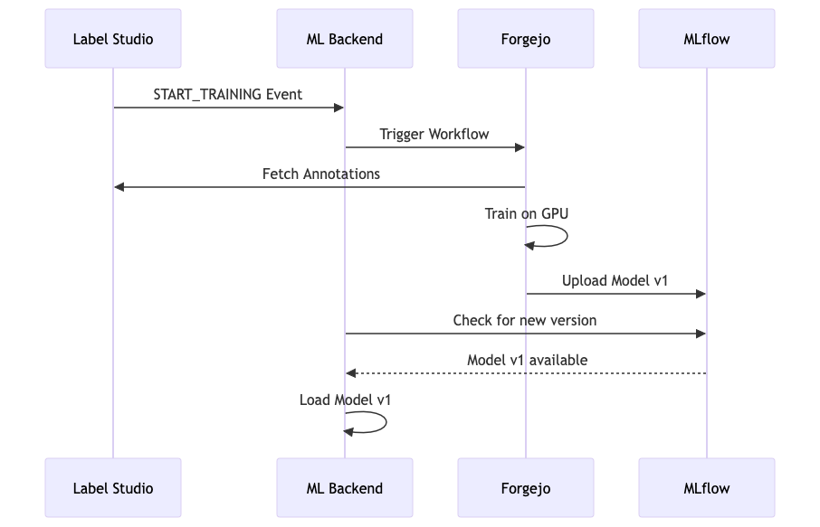 .github/├── workflows/ ├── train.yaml # workflow file for the training pipeline ├── deploy_backend.yaml # workflow file for ml-backend deployment ├── ...models/├── cats_and_dogs_classifier/ # all files in this folder are created with create_new_model.py ├── backend.py # ml-backend Implementation for the cats_and_dogs_classifier ├── config.yaml # configuration for this backend ├── docker-compose.yaml # deployment config for ml-backend (extends ../../src/predict/docker-compose.yaml) ├── labeling_template.xml # labeling template for label-studio ├── model.py # model-architecture (z.B. MobileNetV2)├── ... # More backend and model definitions... ├── ...├── template/ # template files for each model type ├── classification/ ├── common/ ├── detection/scripts/├── create_new_model.py # generates the whole project structure for a new model under models/├── upload_images_to_s3.py # helper script for simple upload of new image assets├── setup_label_studio_project.py # creates a new project in label-studio├── ... # more scripts... src/├── common/ # shared code between predict and train├──train/ ├── Dockerfile ├── docker-compose.yaml # deployment config for training container running the training workflow ├── *.py # base classes for Label Studio ML Backends├── predict/ ├── Dockerfile ├── docker-compose.yaml # base deployment config for ml-backend container running the predictions ├── *.py # base classes for model trainingPhase 1: Setup für ein neues Modell